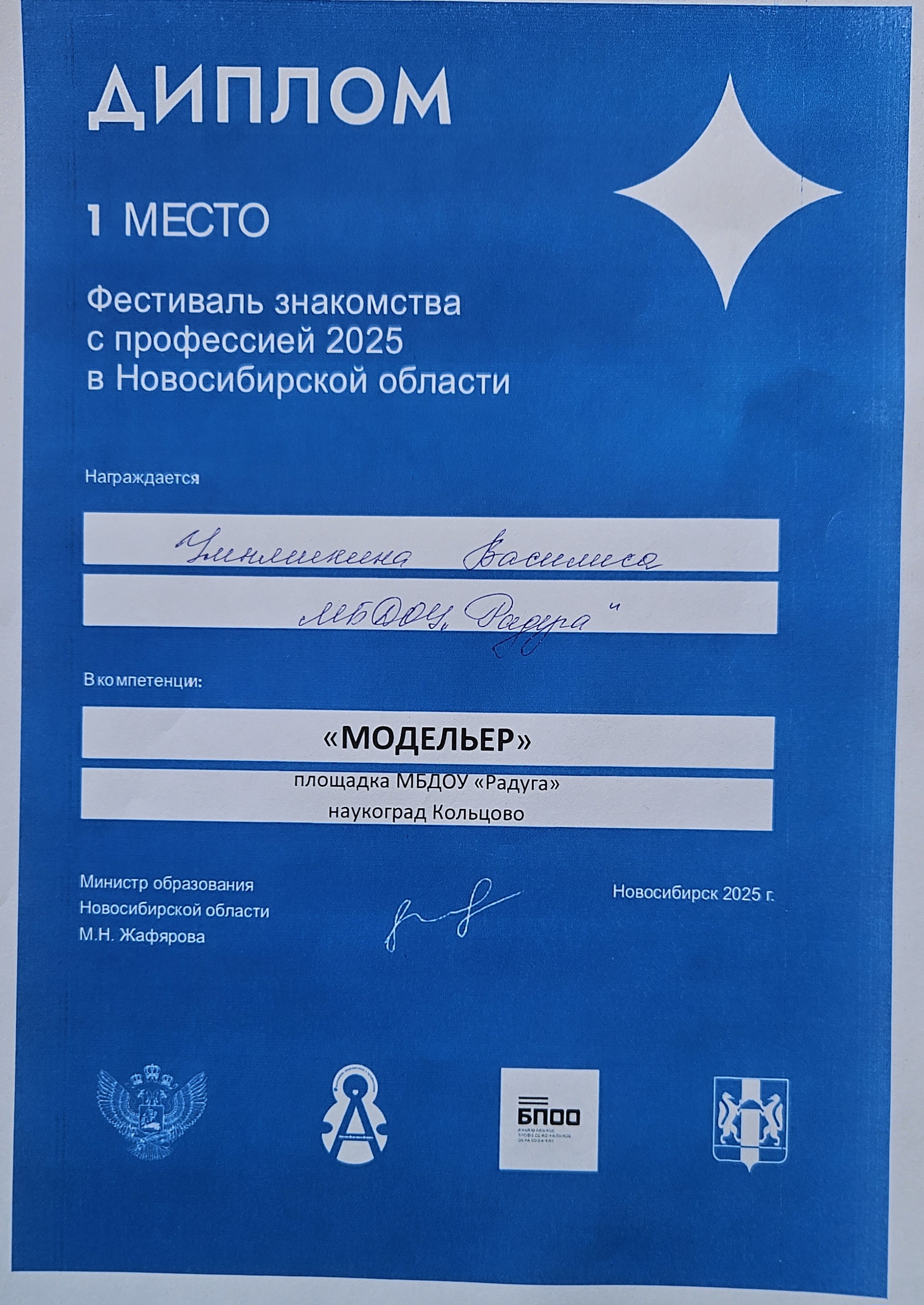 Диплом 1 степени. Модельер. Умняшкина Василиса